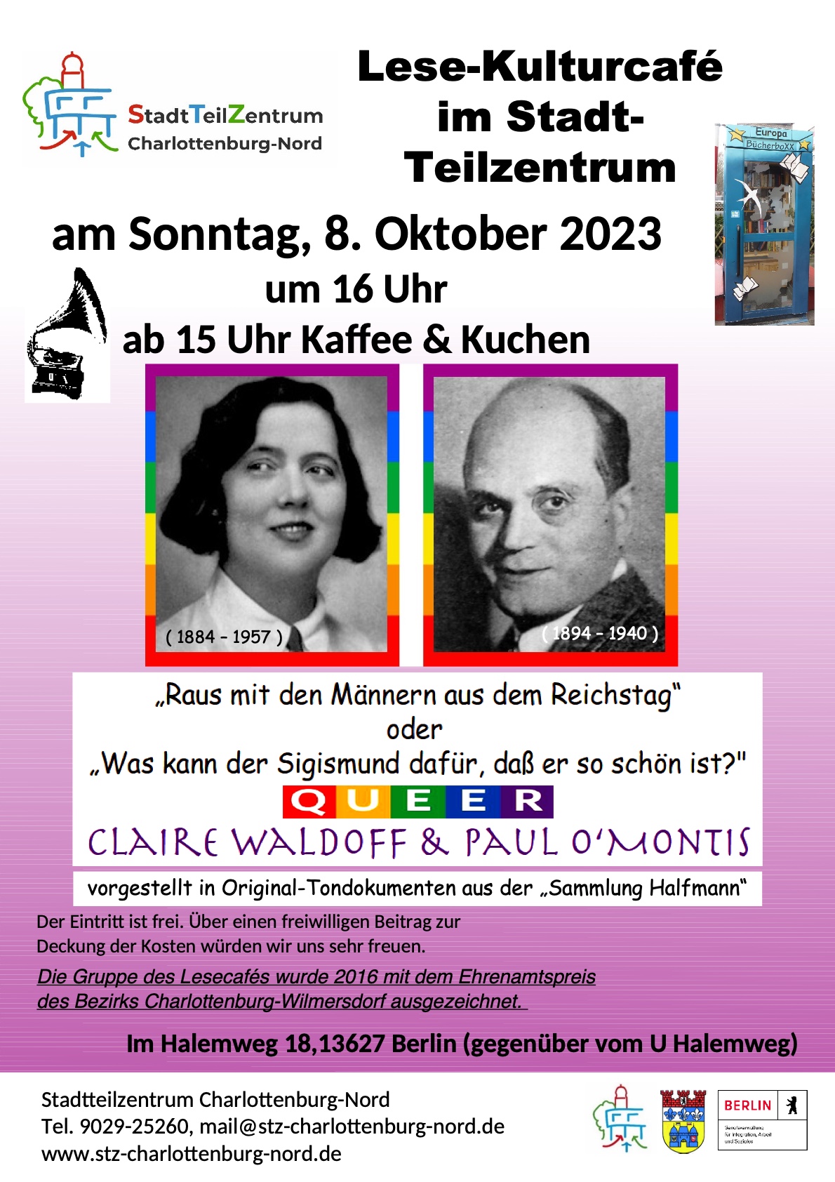 Zu einem Lese-Kulturcafé am Sonntag, 8. Oktober, lädt das Stadtteilzentrum Charlottenburg-Nord, Halemweg 18, ein. Start ist um 15 Uhr mit Kaffee und Kuchen, das Programm beginnt um 16 Uhr. Das Motto ist „Queer“: Im Original-Schellack-Sound erklingen Lieder von Claire Waldoff und Paul O´Montis. DIe Platten stammen aus der Sammlung des Insulaners Michael Halfmann. Der Eintritt ist frei, um eine Spende wird gebeten.